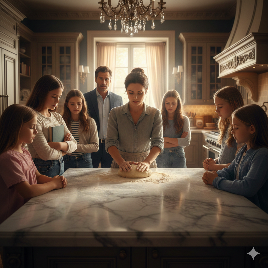 He reached the kitchen to find six daughters gathered around the island—silent.