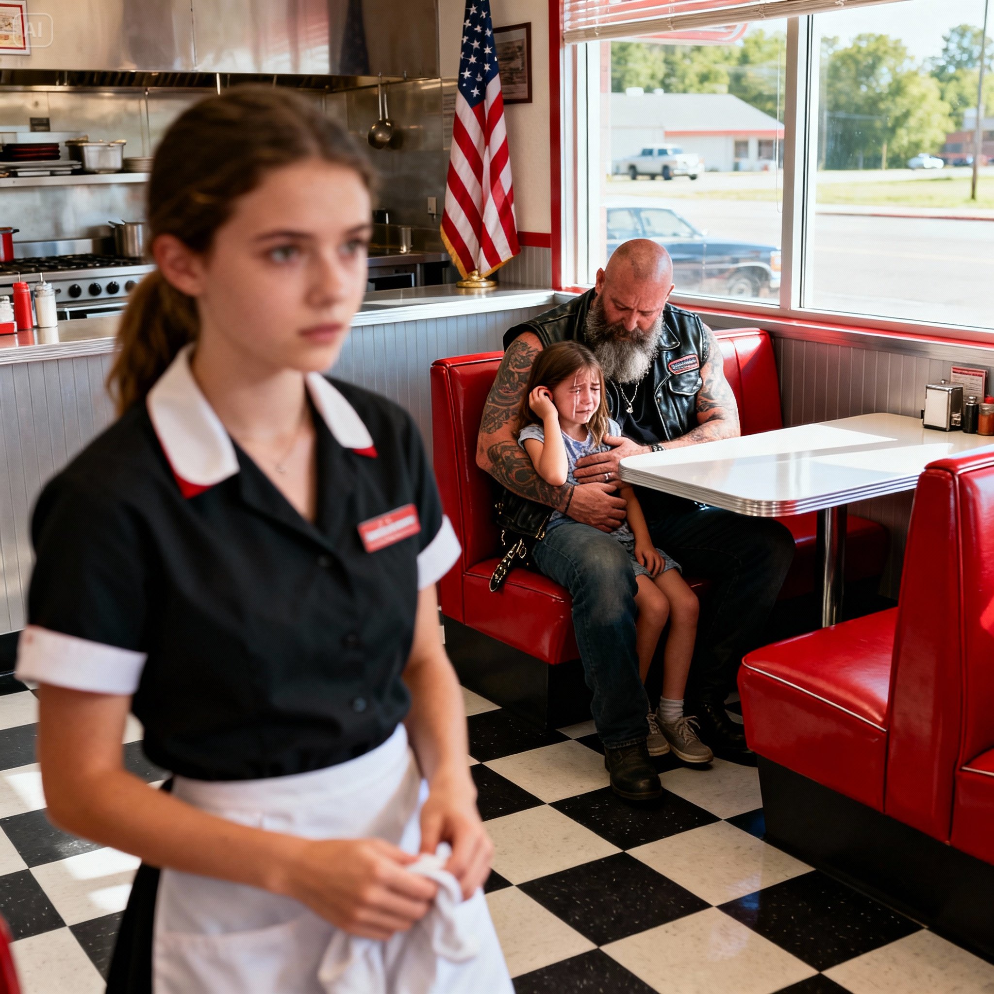 The bell above the diner door jingled softly as a man in a leather jacket stepped inside, carrying a little girl in his arms.