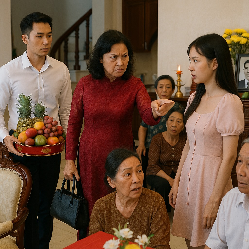 Bà đứng chết lặng trước bức ảnh thờ treo trên bàn thờ gia tiên nhà gái.