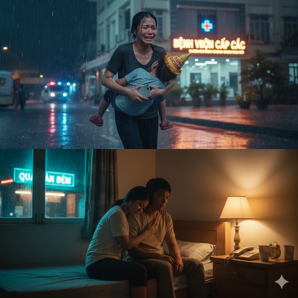 Sáng hôm sau, Tuấn tỉnh dậy trong khách sạn, thấy điện thoại tắt nguồn. Anh cắm sạc, bật máy – và chết lặng. 40 cuộc gọi nhỡ và tin nhắn cuối cùng của vợ: “Chồng ơi… cứu con mình…”. Tim anh như ngừng đập. Anh lao ra khỏi khách sạn, mặc nguyên bộ đồ đêm qua, lái xe thẳng tới bệnh viện.