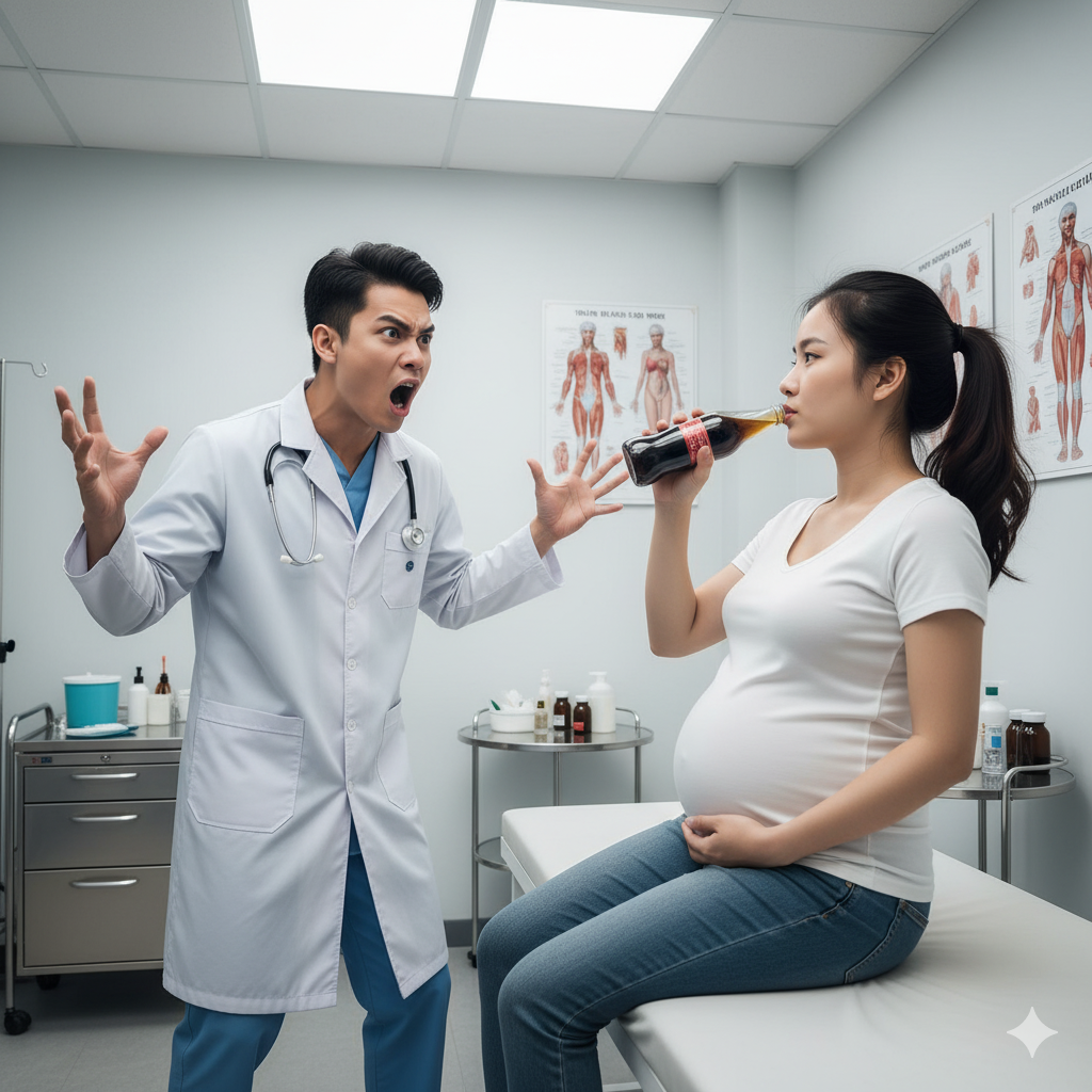 Đúng lúc đó, bác sĩ sản – người trực tiếp siêu âm cho chị – thấy chai nước, tò mò hỏi: