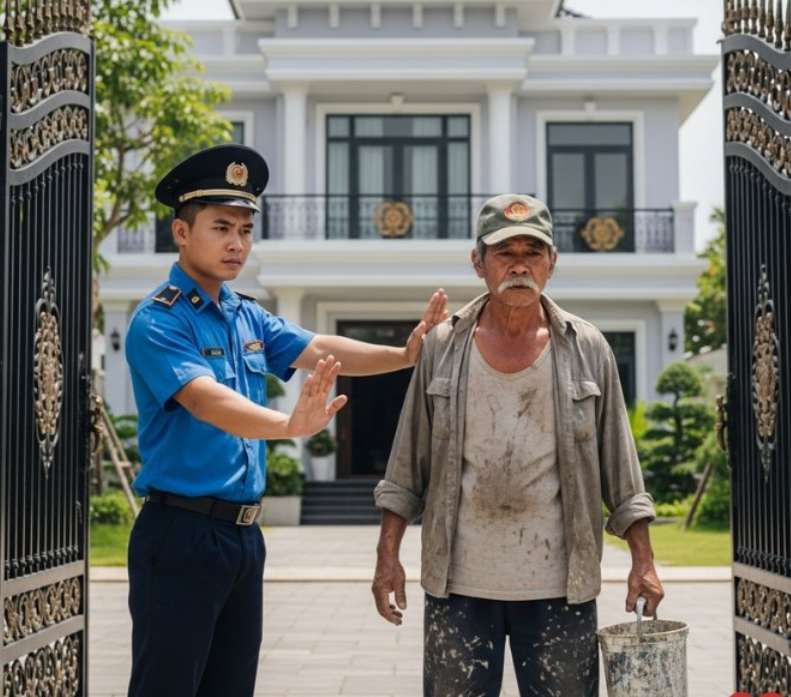 Giữa lúc đó, một người đàn ông mặc bộ đồ lao động cũ, dính bụi xi măng và vôi vữa, đội mũ bảo hộ, tay xách chiếc túi vải bạc màu bước tới. Ông dừng trước cổng, ngẩng lên nhìn tấm bảng tên lấp lánh của gia chủ. Vệ sĩ lập tức khoanh tay chặn lại:
