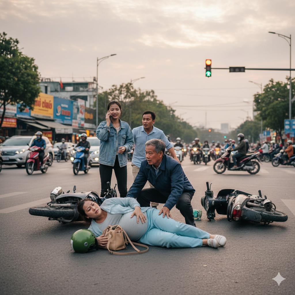 Đang đi giữa đường, bất ngờ chiếc xe máy phanh gấp tránh một ô tô vượt ẩu. Tôi bị hất mạnh, ngã quỵ xuống, nước ối vỡ tung trên nền đường loang lổ nước mưa. Người qua lại xôn xao, có người hét lên: