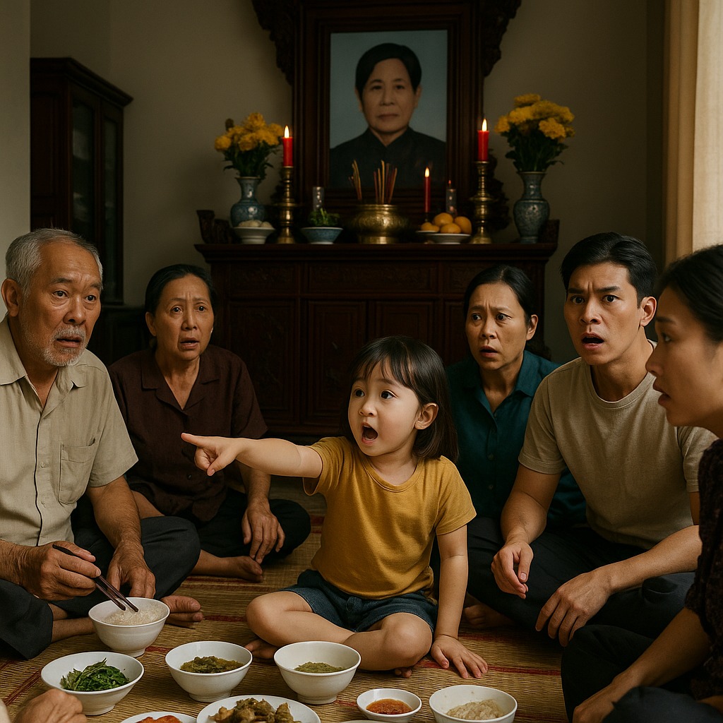 Một vài người cố cười xòa “trẻ con nói linh tinh”, nhưng gương mặt ông ngoại bé biến sắc. Một người cô vợ đột nhiên gằn giọng: