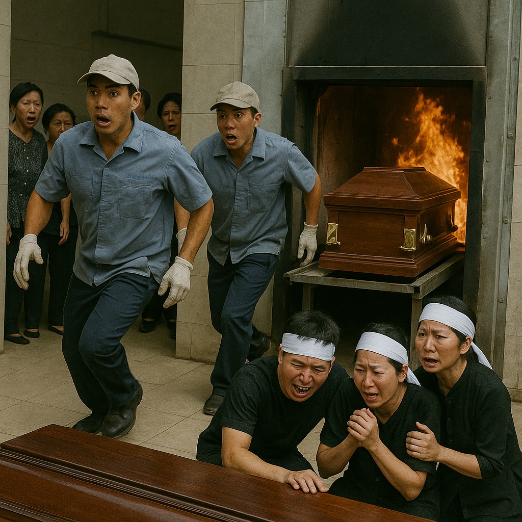 Tại nhà hỏa thiêu, đúng lúc chuẩn bị đẩy quan tài vào lò, bỗng quan tài bất ngờ quay ngược, lật nghiêng liên tục như có lực xoay từ bên trong.