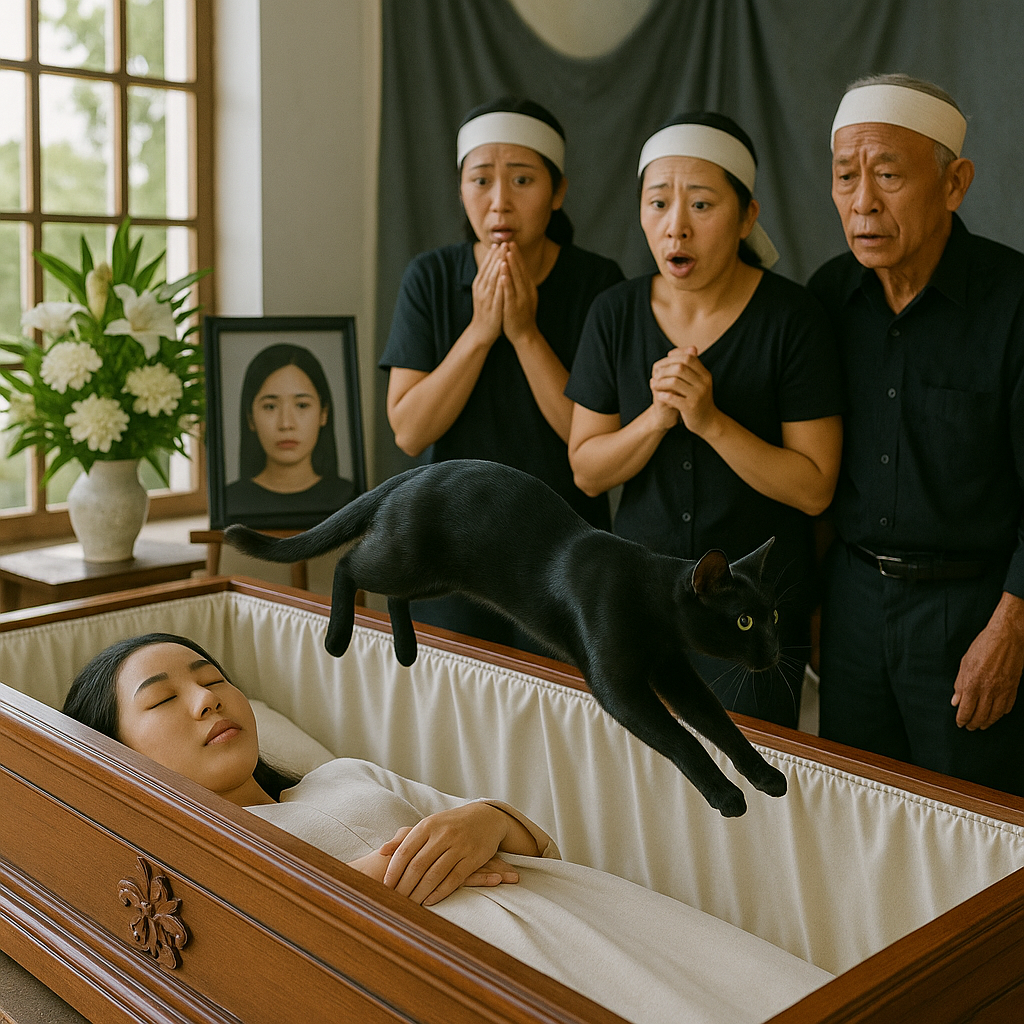Khi lễ nhập quan vừa bắt đầu, một con mèo đen không biết từ đâu nhảy vọt qua hàng rào, phóng lên bệ cửa sổ rồi… nhảy thẳng qua chiếc quan tài còn đang hé nắp. Không ai kịp ngăn.