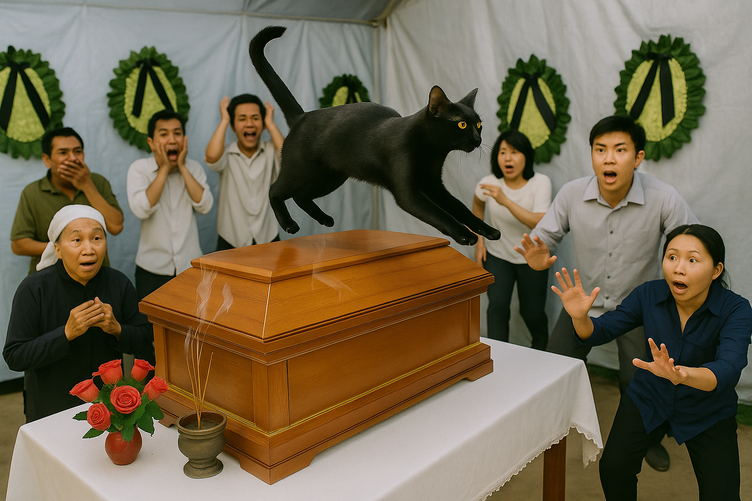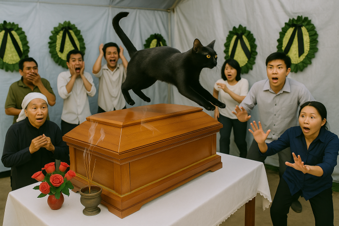 Đúng 3 giờ chiều, khi chuẩn bị đưa linh cữu đi an táng, bỗng một con mèo đen từ đâu bất ngờ phóng qua đầu chiếc hòm. Mọi người chưa kịp phản ứng thì chiếc hòm đột nhiên rung nhẹ. Ban đầu chỉ lắc rất khẽ, rồi sau đó mạnh dần. Tiếng cọt kẹt vang lên giữa không gian tĩnh lặng, như thể có gì đó chạm vào từ bên trong.
