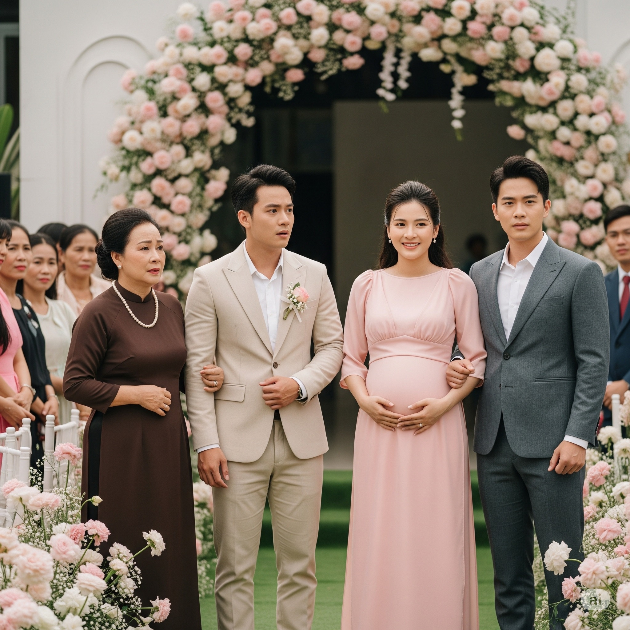 Toàn bộ hội trường im bặt. Tôi thấy tay mẹ run lên bần bật, mặt bà tái mét. Anh Hoàng đứng trên sân khấu cũng ngây người, ánh mắt dán chặt vào bụng chị. Cô dâu mới lúng túng nhìn chồng, không hiểu chuyện gì đang xảy ra.