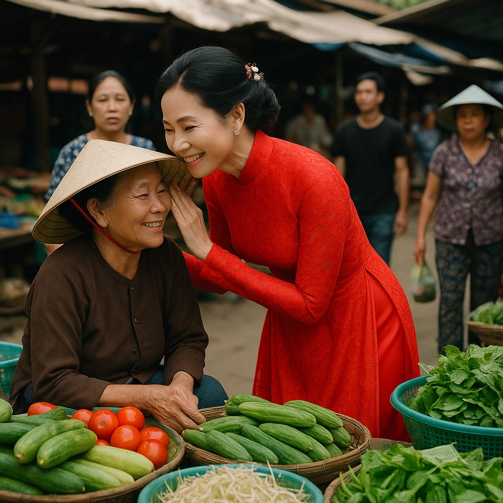 Ở xóm nhỏ ven sông tên là xóm Đìa, ai cũng biết bà Mận – người phụ nữ lạ lùng nhất xóm. Suốt 10 năm nay, ngày nào bà cũng mặc chiếc áo dài cưới màu đỏ, tay ôm giỏ cói ra chợ mua rau, mua trứng, rồi lại lặng lẽ đi về. Dù nắng hay mưa, lễ Tết hay ngày thường, người ta đều thấy bà như thế. Áo cũ sờn vai, nhưng bà vẫn ủi phẳng, đội nón cẩn thận, đi từng bước như đang… rước dâu.