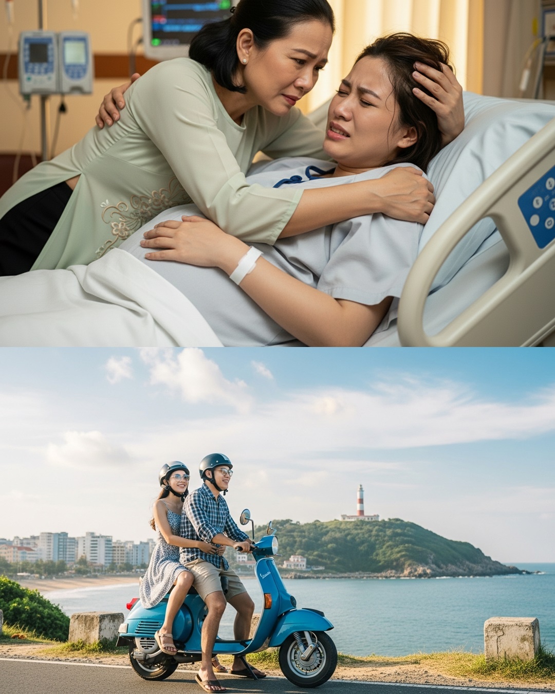 Chưa đầy 15 phút sau, tiếng còi xe vang lên ngoài cổng. Mẹ chồng cô — bà Hòa, mặc áo mưa, tay cầm ô, mặt tái xanh vì lo lắng. Bố chồng lái xe chở hai người thẳng vào viện.