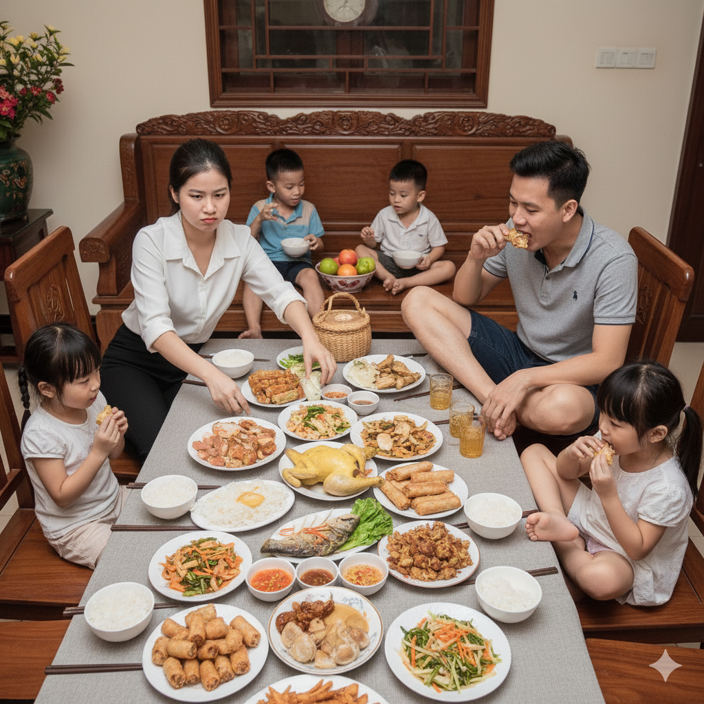 Vừa gọi đồ ăn gà cá ê hề về nhà định gọi mẹ đẻ sang ăn thì thấy mùi mẹ chồng đã liền mời gia đình 2 em chồng với 4 đứa cháu