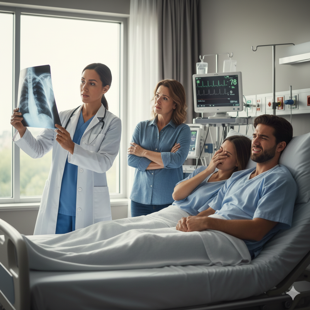 Mark sat in a wheelchair, half-dressed in a hospital gown, IV in his arm — looking terrified. Next to him lay a stretcher holding Amber, who was pale, sweating, and clutching her stomach.