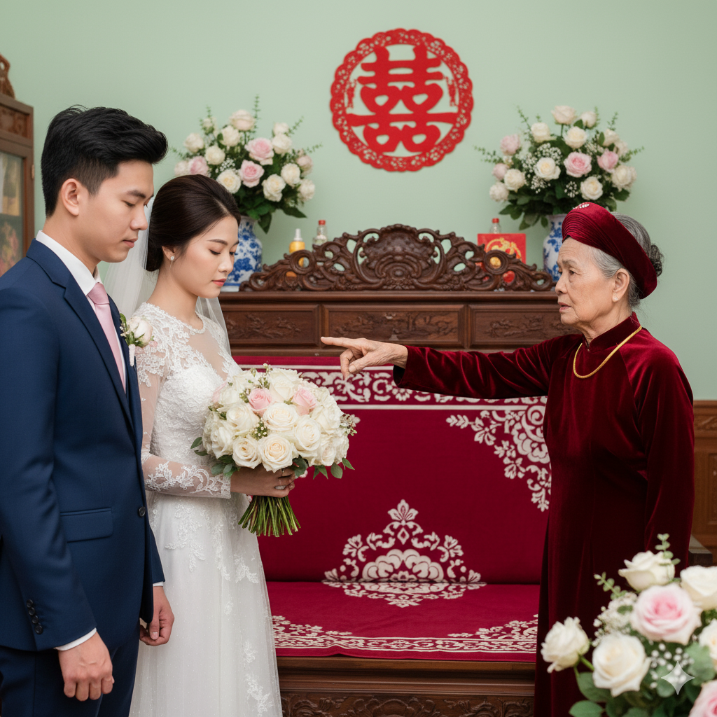 “Giường này ngày xưa bà với ông mày động phòng đấy,” bà nội cười móm mém, vỗ vỗ thành giường, rồi quay sang Hùng và cô dâu mới – Lan – với ánh mắt đầy xúc động. “Giờ đến lượt tụi bây. Bà tin cái giường này hên, nằm vào là sớm có cháu bồng!”