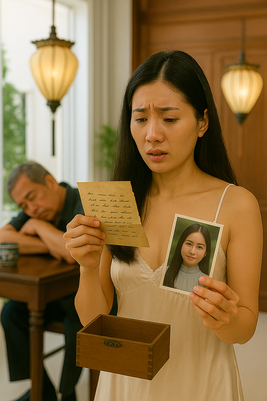 Định mang ly nước vào, tôi gọi cửa nhưng không thấy ông trả lời. Tôi đẩy cửa bước vào thì thấy ông đã ngủ gật trên ghế. Trên bàn là một chiếc hộp gỗ mở hé. Tò mò, tôi nhìn qua và chết sững.