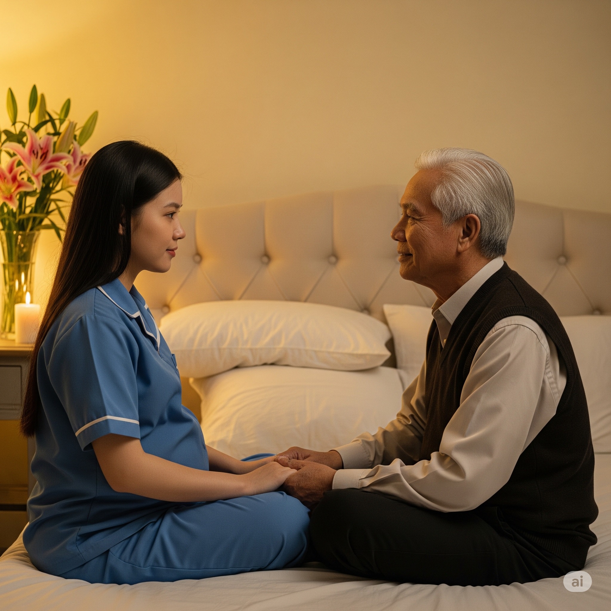 Những ngày sau, Mai vẫn ngồi bóp chân cho ông Phong mỗi tối, nhưng giờ đây bụng cô đã lớn dần. Thi thoảng, ông đưa tay lên bụng cô, khẽ nói: