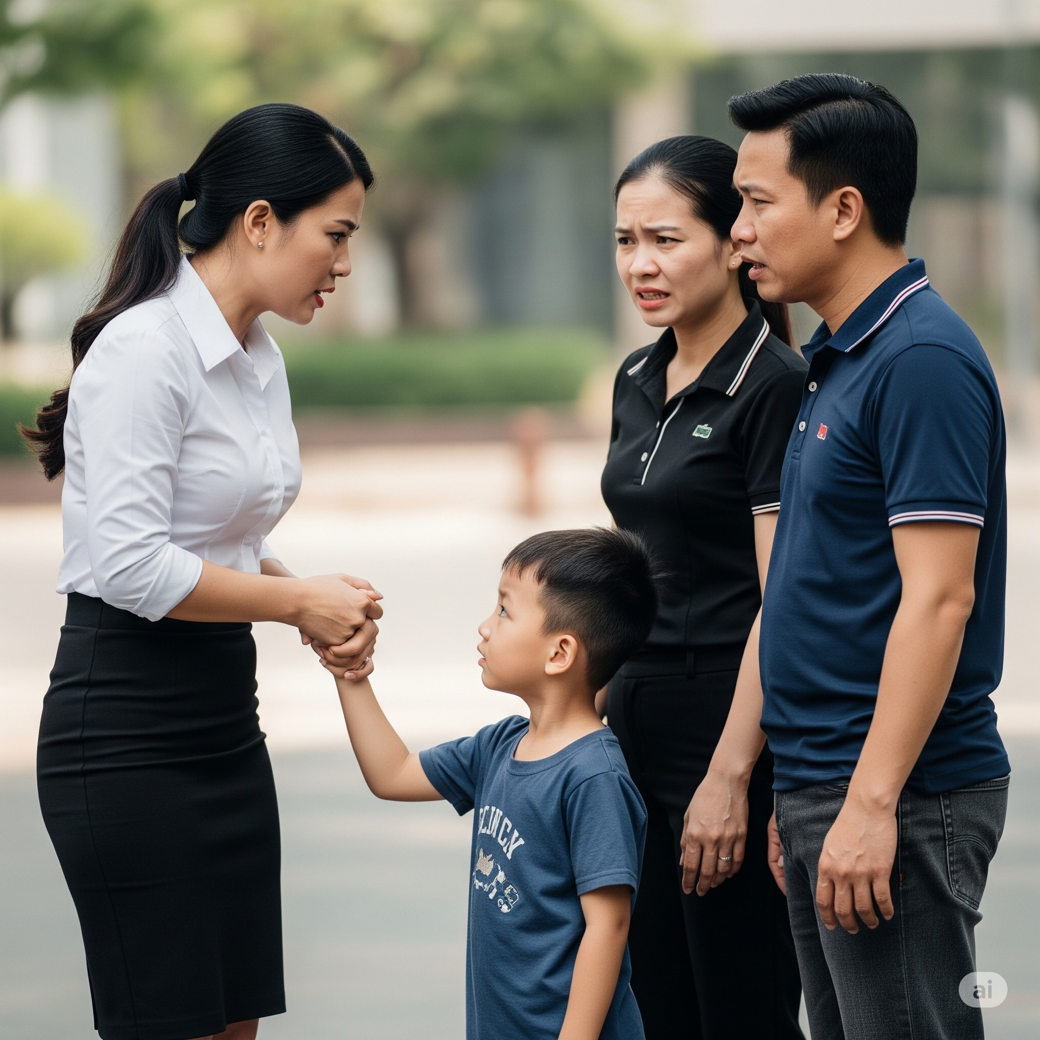 Cô ấy mặc sơ mi trắng, tóc buộc thấp, vẻ chỉn chu và có phần mỏi mệt. Trong tay dắt theo một cậu bé chừng năm tuổi, mắt tròn, tóc rối, miệng ngậm chiếc kẹo mút. Nhưng tôi sững người – không phải vì cô ấy. Mà vì đứa bé.