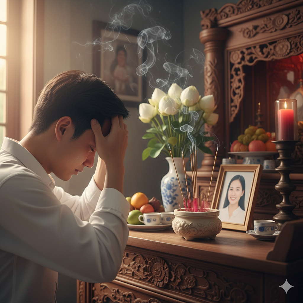Tôi bước vào, ngôi nhà vẫn quen thuộc, chỉ có không khí lặng lẽ khác thường. Trong phòng khách, trên bàn đặt một tấm ảnh Lan, khung viền phủ vải đen. Tôi sững người, tim như ngừng đập.