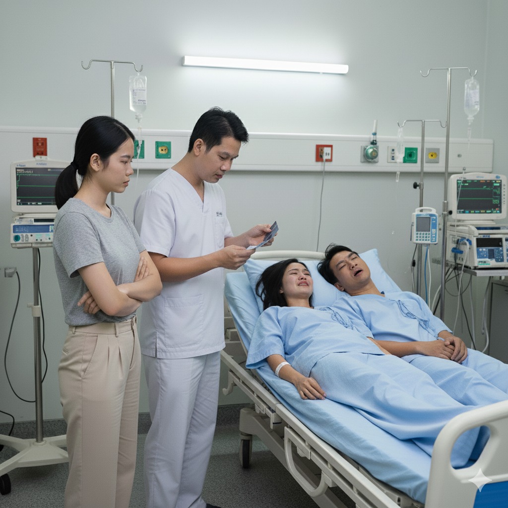 Khi tôi có mặt, cảnh tượng trước mắt khiến tôi lạnh người. Hoàng nằm trên giường bệnh, mồ hôi vã ra như tắm, gương mặt tái mét. Bên cạnh, một cô gái trẻ – rõ ràng chính là “trà xanh” mà anh vẫn lén lút qua lại – cũng trong tình trạng tương tự, thở dốc, mặt mũi nhợt nhạt.