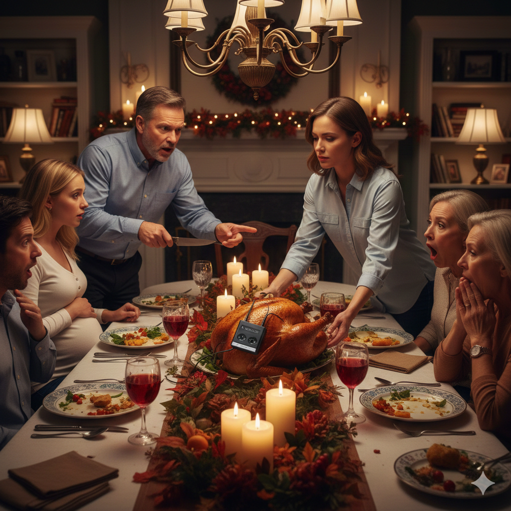 Before I carved, I slid my hand deep into the cavity, found the warmth-wrapped plastic I’d hidden that morning, and pulled out the recording device, holding it up over the untouched feast.