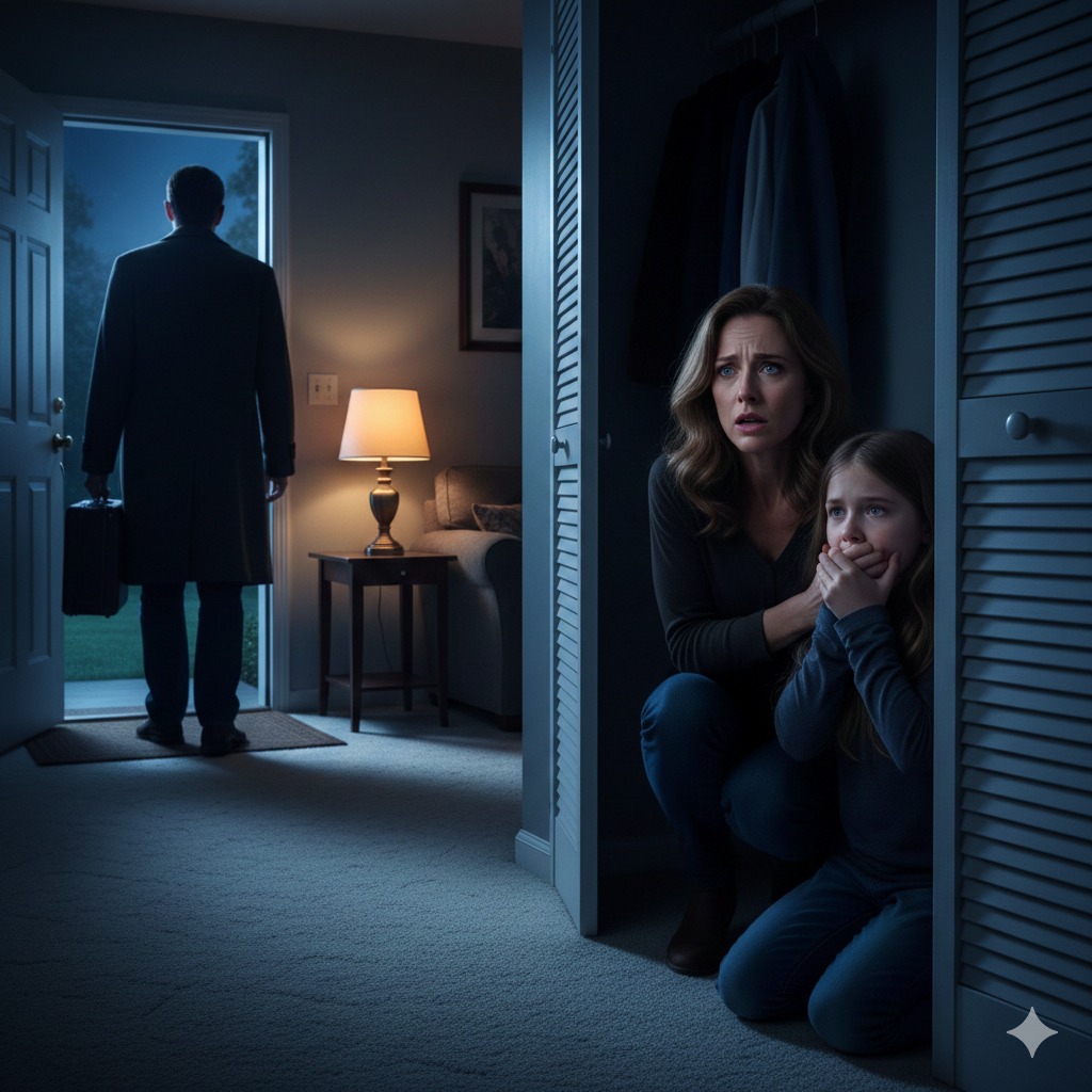 I grabbed Emma’s hand and pulled her toward the living-room closet. We slipped inside, closing the door silently behind us, leaving a thin crack for air.