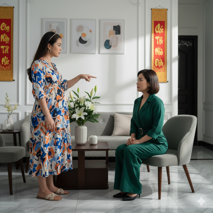 – Uống nước cái gì! – Tú gằn giọng, cố lấy lại khí thế – Tôi đến đây để đòi công bằng! Tôi mang thai con trai của anh Khánh được 5 tháng rồi. Cô nhìn đi! Anh ấy nói đã chán ngấy cô, hứa sẽ ly hôn để cưới tôi và chia nửa căn nhà mặt tiền này cho mẹ con tôi. Cô biết điều thì cuốn gói sớm đi!
