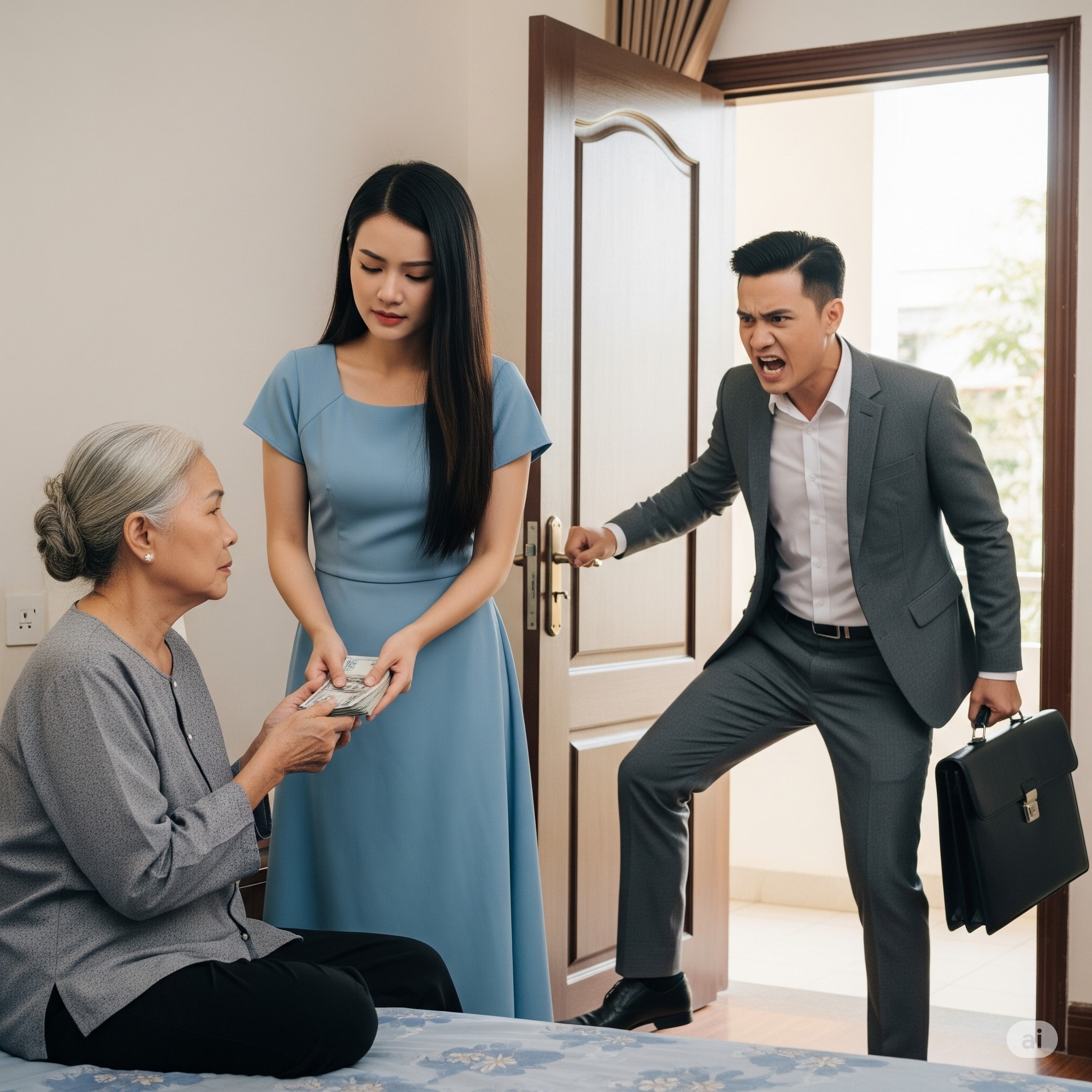 Mặt Hưng đỏ bừng. Cả tháng nay, anh phải xoay xở trả nợ ngân hàng, đóng học phí cho con, chưa kịp mua bộ đồ mới nào. Vậy mà vợ anh dám lén lút đưa cho mẹ đẻ cả cục tiền? Máu nóng dồn lên não, anh đạp mạnh cửa bước vào, gằn giọng: