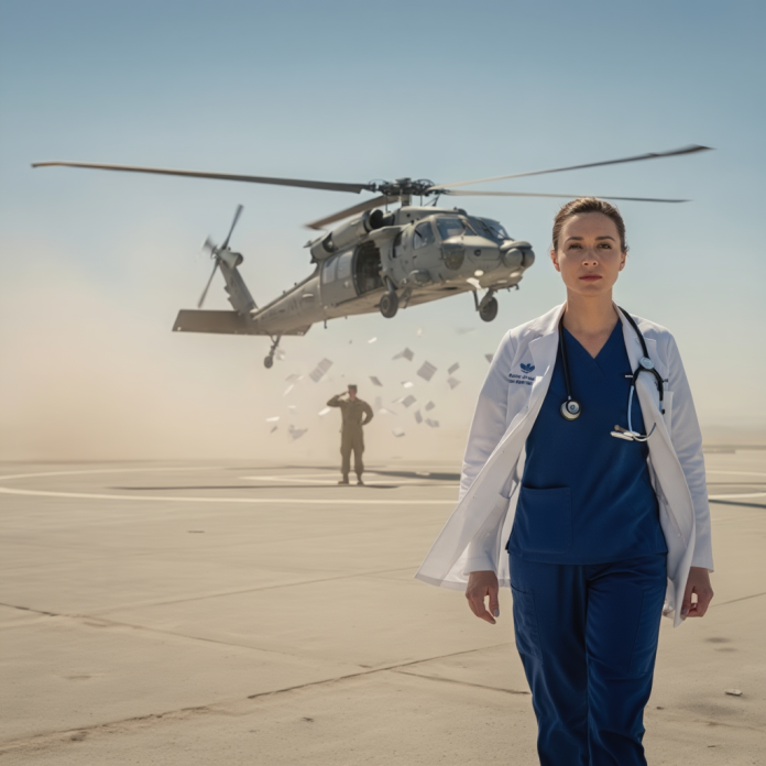 A massive military helicopter — Navy MH-60 Seahawk — was descending fast toward the hospital rooftop, rotors slicing the air like thunder.