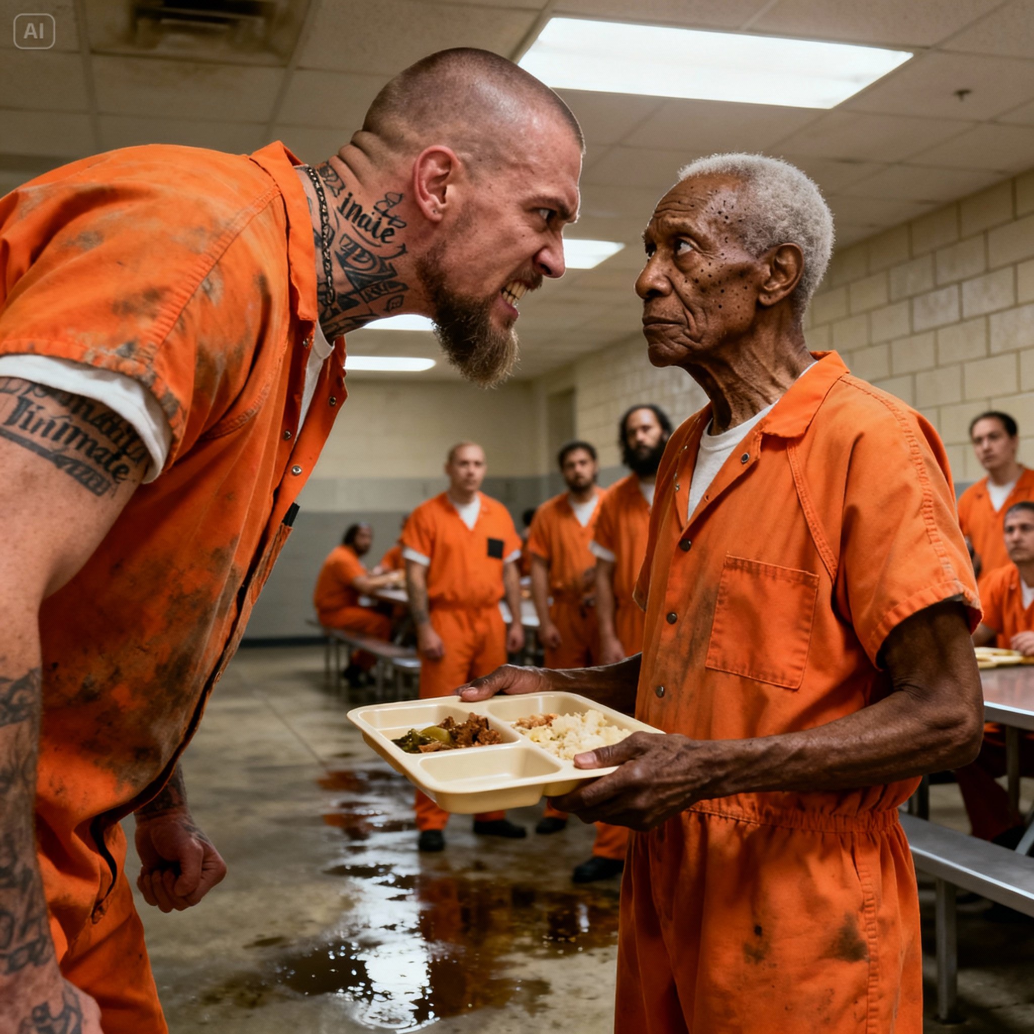 The old man entered the cafeteria with a tray trembling in his hands, shoulders rounded as if the years themselves had bent him. His hair, thin and white, clung to his scalp like frost. His prison uniform hung loose, swallowed by a body that looked more memory than muscle. The guards barely glanced his way. In a place like Stonebridge Federal, attention was a currency the weak couldn’t afford.