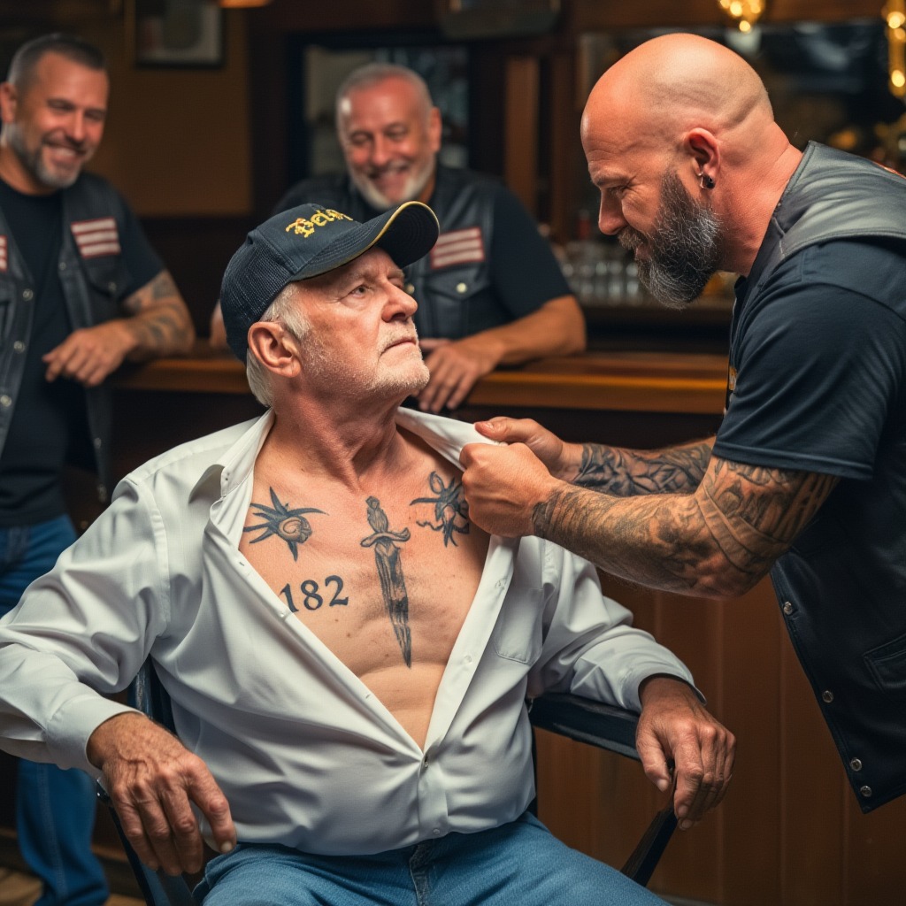 They laughed at the old, disabled veteran in the bar—calling him weak, forgotten, easy prey. But when his shirt tore open, revealing a Navy SEAL dagger and his kill count inked beneath… every biker went silent. That’s when they realized — they picked the wrong veteran to mess with.
