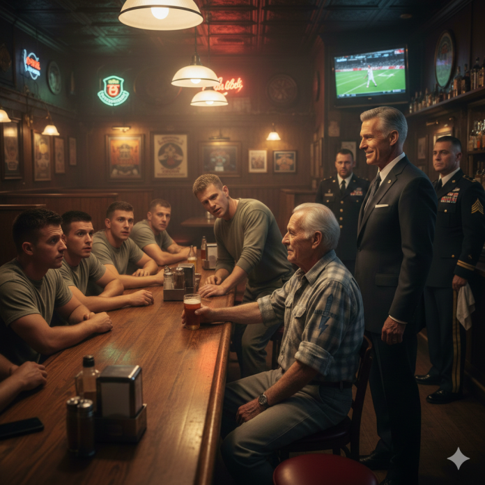 The bar was loud in the way only a military town bar could be—half laughter, half bravado, and just enough bitterness floating in the air to remind everyone that war never really stayed overseas.