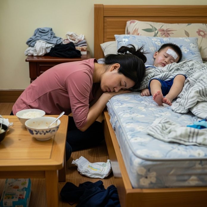 Anh bật đèn. Một “bãi chiến trường” hiện ra. Thằng Tôm, con trai anh, đang nằm mê man trên giường. Mặt nó đỏ bừng, hơi thở khò khè, nặng nhọc. Quần áo nó ướt sũng mồ hôi, và cái tã nó đang mặc đã trĩu nặng, chất bẩn tràn cả ra ga giường.