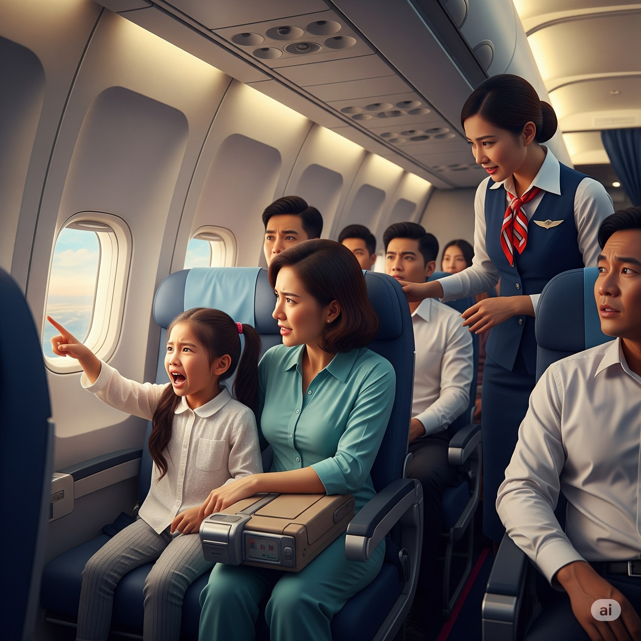 Mọi người xung quanh đều nhìn về phía hai mẹ con. Tiếp viên tiến lại trấn an, chị Nhàn thì vội vã dỗ dành, nghĩ con bé đang mệt hay quấy. Nhưng Bông càng la to hơn, tay chỉ thẳng vào chỗ trống bên cạnh ghế: